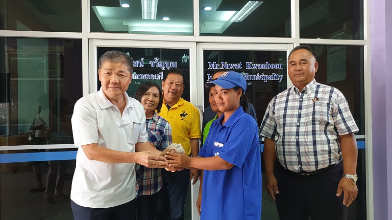 วันนี้ (11 มี.ค.) ที่เทศบาลเมืองกระทุ่มแบน จ.สมุทรสาคร คณะผู้บริหารเทศบาลฯ ร่วมเป็นสักขีพยานให้กับนางสมนึก สายเนตร อายุ 60 ปี กับ น.ส.ฐิตินาฏ สายเนตร อายุ 36 ปี ลูกสาว ทั้งสองเป็นพนักงานทำความสะอาดของเทศบาลฯ มอบกระเป๋าใส่เงินสดเกือบ 30,000 บาท คืนให้เจ้าของ คือ นายนิเวศน์ ปัทมศิริกุล อายุ 67 ปี เจ้าของบริษัท พร้อมกันนี้เทศบาลฯ ยังมอบเกียรติบัตรพนักงานดีเด่นแก่นางสมนึก และ น.ส.ฐิตินาฏ เพื่อยกย่องในคุณงามความดี ขณะที่นายนิเวศน์ ได้มอบเงินจำนวนหนึ่งเป็นกำลังใจแก่แม่ลูกทั้งสอง