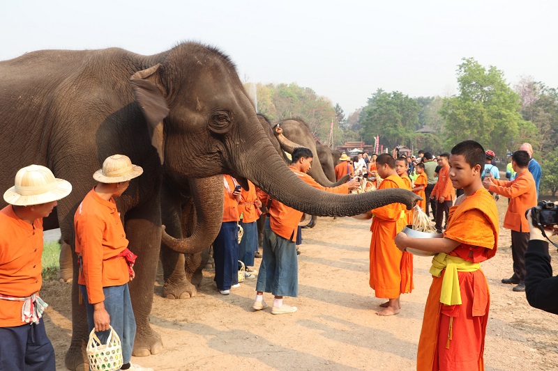 ช้างแสนรู้ลำปางใส่บาตรเป็นมงคลวันช้างไทย