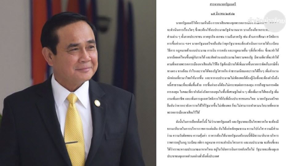 ผู้สื่อข่าวรายงานว่า วันนี้ (15 มี.ค.) พล.อ.ประยุทธ์ จันทร์โอชา นายกรัฐมนตรี เผยแพร่สารจากนายกรัฐมนตรี มีเนื้อหาถึงการหาเสียงของทุกพรรคการเมือง กรณีการชูนโยบายว่าจะดำเนินการเรื่องใดๆ ซึ่งจะต้องใช้งบประมาณรัฐจำนวนมาก บางเรื่องอาจส่งผลกระทบต่อภาคส่วนต่างๆ ทั้งภาคประชาชน ภาคธุรกิจ เอกชน รวมถึง ภาครัฐ เช่น ด้านการศึกษา สวัสดิการ การขึ้นค่าแรง