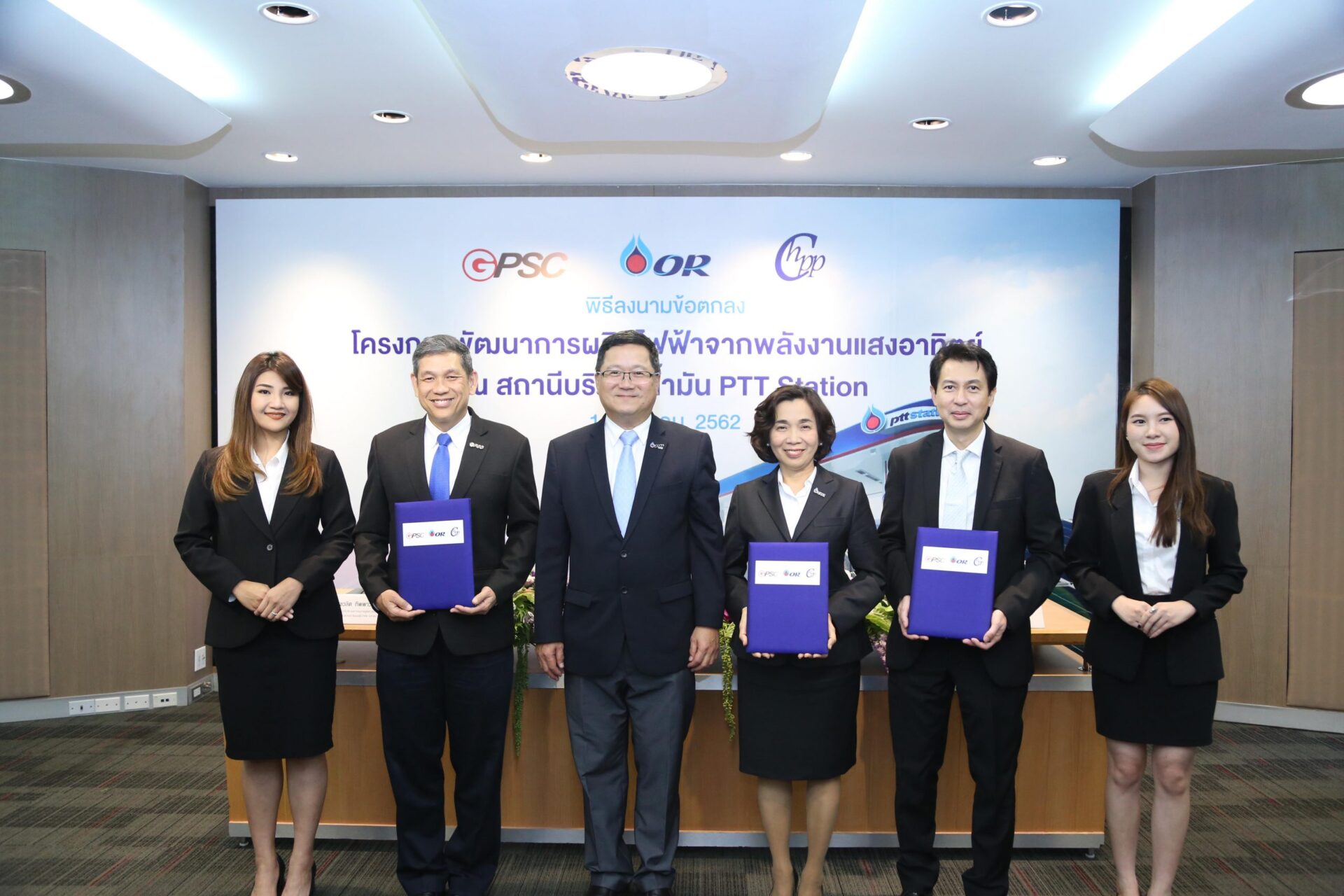 ทั้งนี้ ความร่วมมือดังกล่าว ได้เริ่มตั้งแต่ปี 2561 โดยทดลองติดตั้งแผงโซล่า เซลล์ ในสถานีบริการน้ำมันฯ จำนวน 3 แห่ง ในจังหวัดกรุงเทพฯ ชลบุรี และเชียงใหม่ ซึ่งคาดว่าจะสามารถผลิตได้ภายในครึ่งปีแรกของปี 2562 และจะร่วมกันศึกษาและพัฒนาระบบผลิตไฟฟ้าจากพลังงานแสงอาทิตย์พร้อมระบบกักเก็บพลังงาน (Energy Storage) ในสถานีบริการน้ำมันฯ โดยจะพิจารณารูปแบบดำเนินธุรกิจที่เหมาะสมร่วมกัน โดย พีทีที โออาร์ จะเป็นผู้คัดเลือกรูปแบบพื้นที่ หรือ อาคาร ที่มีความเหมาะสมภายในสถานีบริการฯ เพื่อให้ทาง กลุ่ม จีพีเอสซี ออกแบบและติดตั้งอุปกรณ์ที่เกี่ยวข้องกับการผลิตไฟฟ้าจากแสงอาทิตย์และการกักเก็บพลังงานไฟฟ้าให้มีความเหมาะสม โดยมีแผนงานร่วมกันในการขยายการติดตั้งแผงโซล่า เซลล์ ภายในสถานีบริการน้ำมันฯ ให้เป็น 50 แห่ง ภายในปี 2566