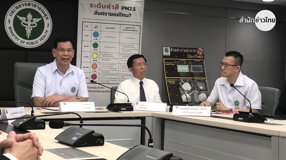 นพ.สุขุม กาญจนพิมาย ปลัดทรวงสาธารณสุข ประชุมระบบวิดีโอคอนเฟอร์เรนส์ปัญหาฝุ่นละออขนาดเล็กPM2.5ในภาคเหนือและอีสานเข้าข่ายวิกฤตหลายพื้นที่ กำชับให้ทุกจังหวัดติดตามสถานการณ์ค่าฝุ่นละอองอย่างใกล้ชิด เพื่อปรับใช้ให้เหมาะสมในพื้นที่ โดยวิกฤตสีเหลือง สีส้ม สีแดง ต้องเริ่มเฝ้าระวังประชาชน ห่วงเด็ก คนชราและผู้ป่วยโรคระบบทางเดินหายใจได้รับผลกระทบ เนื่องจากข้อมูลอัตราการป่วย พบใน 4 โรคหลัก ทั้งระบบทางเดินหายใจ ,หัวใจและหลอดเลือด ,ดวงตา และผิวหนัง มีการขยับเพิ่มขึ้น แต่ไม่สามารถบ่งชี้ว่ามาจากฝุ่นได้อย่างชัดเจนแต่ผู้ป่วยเหล่านี้ มัฏมีอาการไวต่อฝุ่นฉะนั้นต้องจัดการบ้านเรือนให้สะอาดด้วย