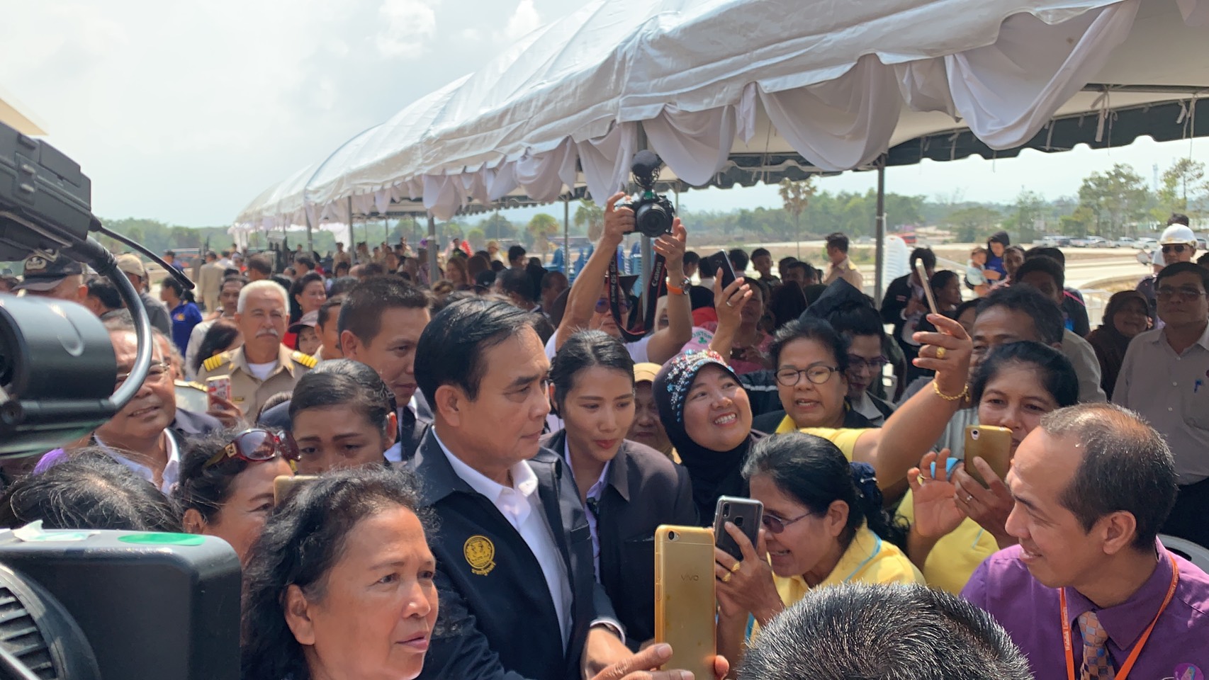 นายกรัฐมนตรียังได้ร้องเพลง “เราจะทำตามสัญญาขอเวลาอีกไม่นาน” พร้อมบอกว่า 5 ปี สำหรับประเทศไทยไม่ถือว่านาน เพราะอย่างไรก็ต้องนาน จากนั้น นายกรัฐมนตรี เดินทักทายประชาชน พร้อมบอกว่า 24 มีนาคมนี้ ขอให้เลือกให้ดี และที่มาไม่ได้มาหาเสียง นอกจากนี้ พระสงฆ์ได้มอบ ตาพรานบุญ วัดยางใหญ่ ให้กับนายกรัฐมนตรีด้วย ซึ่งตลอดการเดินทักทาย ประชาชน ได้มอบดอกกุหลาบ และตะโกน “ลุงตู่ สู้ๆ”โดยนายกฯ บอกให้สู้ไปด้วยกัน ทั้งนี้ มีชาวบ้านที่เป็นชาวประมง นำปูดำปูทะเล ใส่กระเช้า ห่อกระดาษบางๆ มามอบให้นายกฯ โดย นายกฯ เอามือไปจับ บนกระดาษโดยที่ไม่รู้ว่าเป็น ปู เมื่อชาวบ้านบอกว่าเป็นปู นายกฯก็รีบชักมือออก พร้อมกล่าวแบบตกใจว่า “ปูหรอ เดี๋ยวมันก็หนีบผมสิ” เรียกเสียงหัวเราะจากชาวบ้าน.-สำนักข่าวไทย