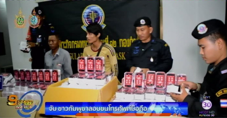 สระแก้ว 28 ส.ค. – เจ้าหน้าที่ด่านอรัญประเทศ จังหวัดสระแก้ว สกัดจับ 2 กรรมกร ชาวกัมพูชา ขณะเข็นรถเข็น ออกมาจากลานจอดรถ ห้างสรรพสินค้า ทางเข้าหน้าด่าน พรมแดนอรัญประเทศ จังหวัดสระแก้ว เพื่อมารอเวลาด่านเปิด เจ้าหน้าที่พบพฤติกรรมีพิรุธ จึงขอตรวจค้น พบลังกระดาษ ปิดมิดชิด 8 ใบ ตรวจสอบภายใน บรรจุโทรศัพท์มือถือ เกือบ 500 เครื่อง โดยไม่มีเอกสาร ขออนุญาตนำออก และทำพิธีศุลกากร สอบสวนทั้งสองคนอ้างว่า เป็นเพียงผู้รับจ้างเข็นรถ ได้ค่าจ้างคนละ 300 บาท แต่ไม่ทราบว่า ภายในบรรจุอะไรเจ้าหน้าที่จึงควบคุมตัวไว้ขยายผลดำเนินคดีว่าจ้างต่อไป. -สำนักข่าวไทย