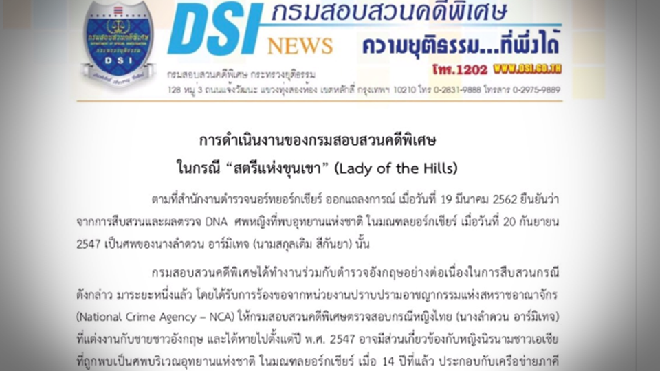 กรมสอบสวนคดีพิเศษ (ดีเอสไอ) ออกเอกสารข่าวชี้แจงความคืบหน้าการสืบสวนสอบสวนกรณี ‘สตรีแห่งขุนเขา’ (Lady of the Hills) หลังจากสำนักงานตำรวจนอร์ทยอร์กเชียร์ ออกแถลงการณ์ เมื่อวันที่ 19 มี.ค.2562 ยืนยันว่าจากการสืบสวนและผลตรวจDNA ศพหญิงที่พบอุทยานแห่งชาติ ในมณฑลยอร์กเชียร์ เมื่อวันที่ 20 ก.ย.2547 เป็นศพของนางลำดวน อาร์มิเทจ (นามสกุลเดิม สีกันยา)