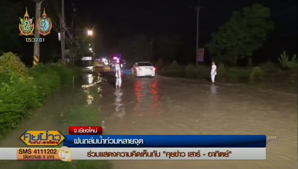 เมื่อช่วงค่ำวานนี้ (27 ส.ค.) เกิดฝนตกหนักในพื้นที่ อ.สันทราย จ.เชียงใหม่ นานกว่า 1 ชั่วโมง ทำให้น้ำป่าไหลหลากลงลำเหมือง และระบายน้ำไม่ทัน จนเอ่อล้นเข้าท่วมเส้นทางเชื่อมระหว่างมหาวิทยาลัยแม่โจ้กับหมู่บ้านพัฒนาทรายแก้ว ต.ป่าไผ่ อ.สันทราย จ.เชียงใหม่ ระดับน้ำท่วมขังถนนสูงกว่า 50 เซนติเมตร เป็นระยะทางยาวกว่า 50 เมตร รถเล็กสัญจรลำบาก เจ้าหน้าที่เทศบาลแม่โจ้ต้องนำรถไฟฟ้าส่องสว่างมาติดตั้ง และจัดเจ้าหน้าที่อำนวยความสะดวกด้านการจราจร จัดคิวให้รถวิ่งทีละด้าน เกรงรถจะวิ่งตกร่องน้ำข้างทาง โดยมีป้ายทะเบียนรถยนต์ที่วิ่งผ่านถูกน้ำซัด ป้ายทะเบียนหลุดตกน้ำจำนวนมาก ให้ไปรับคืนได้ที่เจ้าหน้าที่กู้ภัยแม่โจ้