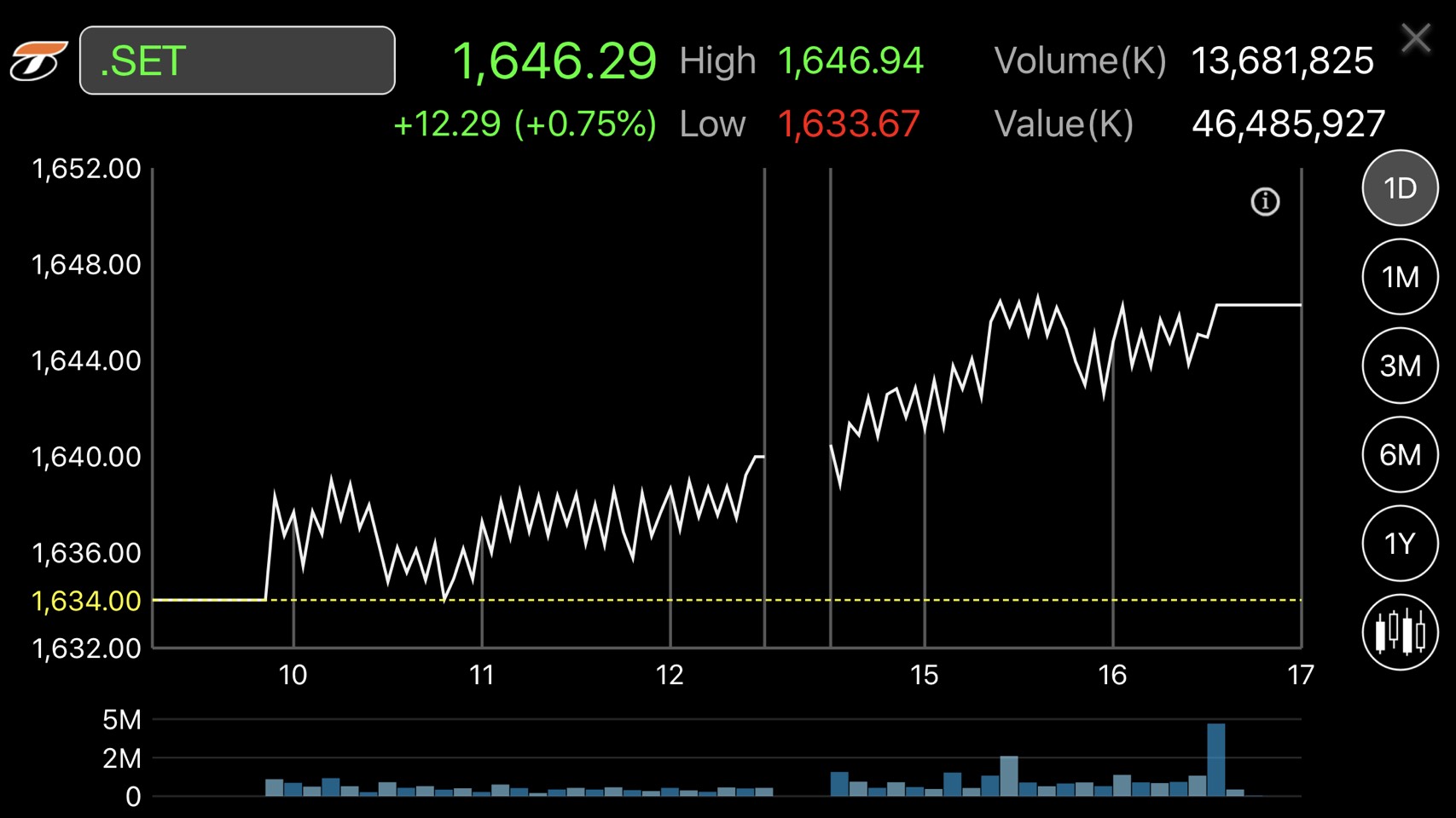 การซื้อขายหุ้นวันนี้ ดัชนีหุ้นไทยเคลื่อนไหวในแดนบวกเป็นส่วนใหญ่ โดยดัชนีฯแตะจุดสูงสุดที่ 1,646.94 จุด และแตะจุดต่ำสุดที่ระดับ 1,633.67 จุด