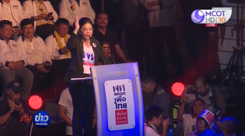 กทม. 22 มี.ค.-คึกคัก การปราศรัยของพรรคเพื่อไทยปิดการเลือกตั้ง 62 มีแกนนำคนสำคัญขึ้นเวทีพร้อมเพียง ไฮไลอยู่ที่ คุณหญิงสุดารัตน์ ขอให้เลือกพรรคเพื่อไทยถล่มทลาย