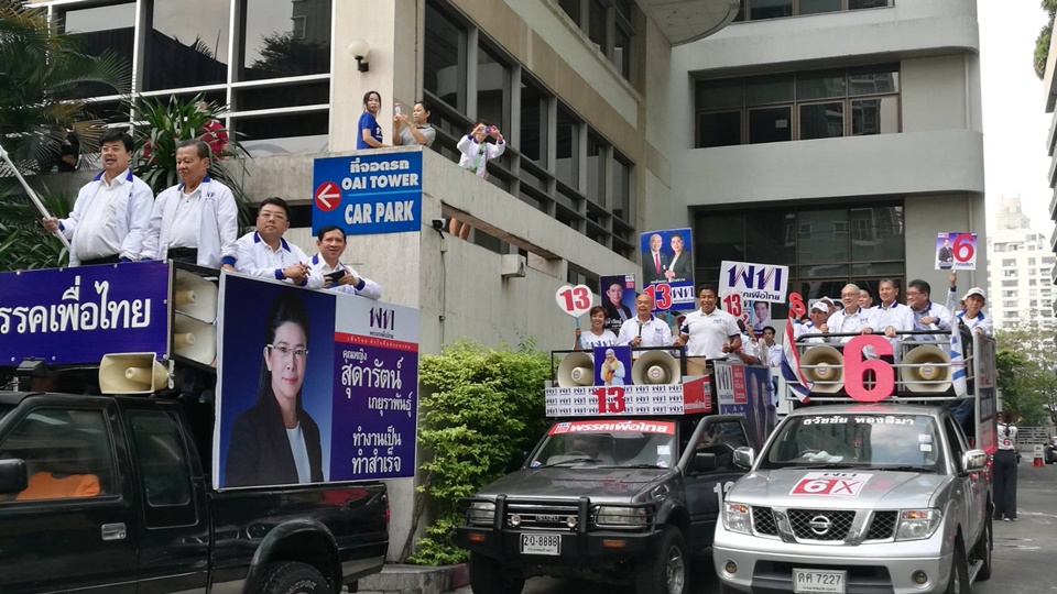 พรรคเพื่อไทย 23 มี.ค.-แกนนำพรรคเพื่อไทยปล่อยขบวนรถแห่รณรงค์เลือกตั้งกระจายทั่วกรุงเทพฯ ปิดการหาเสียง แสดงความพร้อมครั้งสุดท้ายก่อนเลือกตั้ง ขอคนไปใช้สิทธิให้มากเพื่อขจัดอำนาจที่ไม่ถูกต้อง