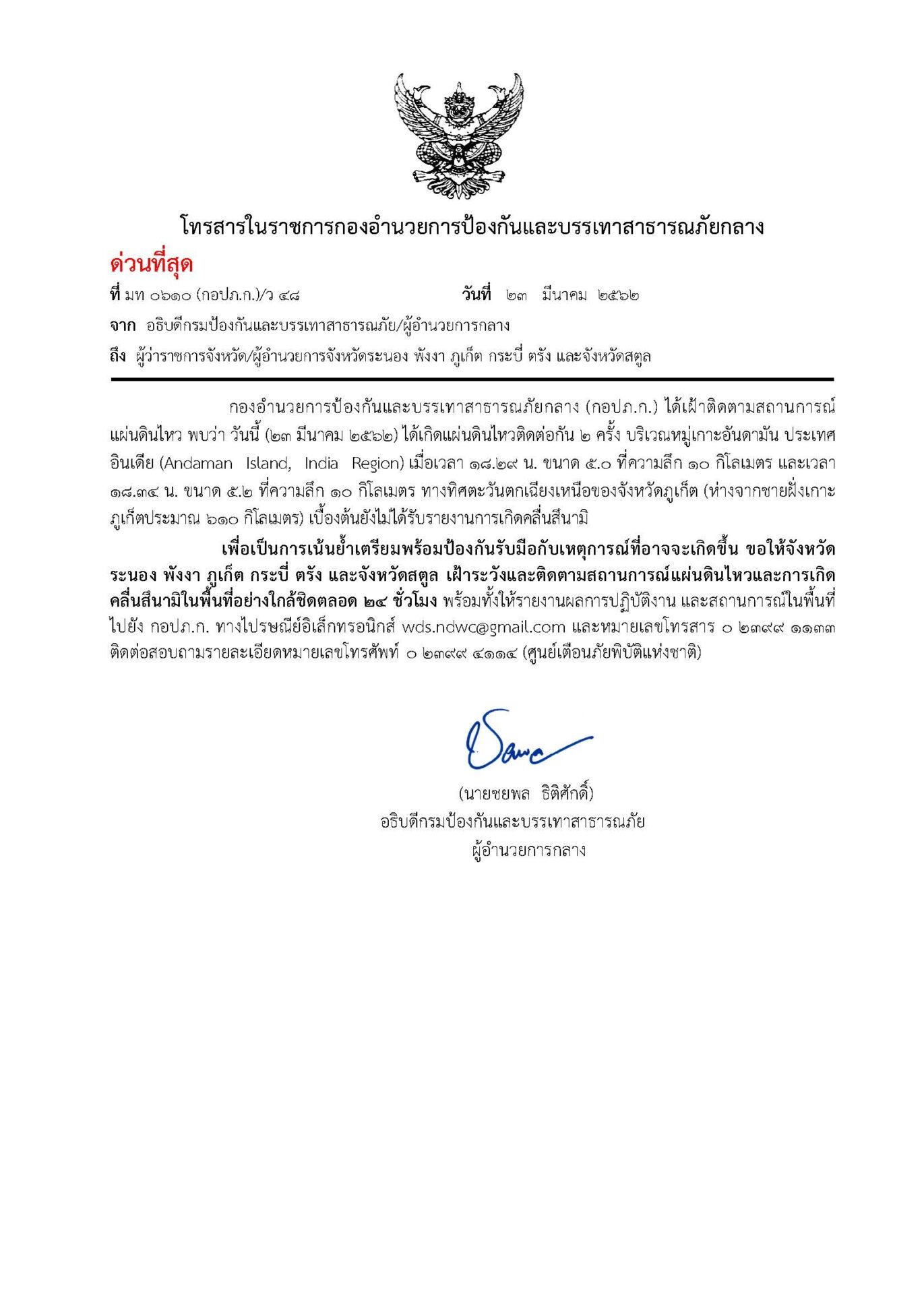 23 มี.ค.-อธิบดี ปภ. ออกประกาศแจ้งเตือน จ.ภูเก็ต พังงา กระบี่ ระนอง ตรัง สตูล เฝ้าระวังติดตามการเกิดสึนามิ หลังเกิดเหตุแผ่นดินไหวในทะเล 2 ครั้งต่อเนื่องทางทิศตะวันตกเฉียงเหนือของ จ.ภูเก็ต ห่างจากชายฝั่งภูเก็ตราว 610 กม. ทั้งนี้ประชาชนในพื้นที่ภูเก็ตระบุว่ารับรู้ได้ถึงแรงสั่นสะเทือน แต่จนถึงขณะนี้ยังไม่มีรายงานการแจ้งเตือนการเกิดสึนามิตามมาแต่อย่างใด.-สำนักข่าวไทย