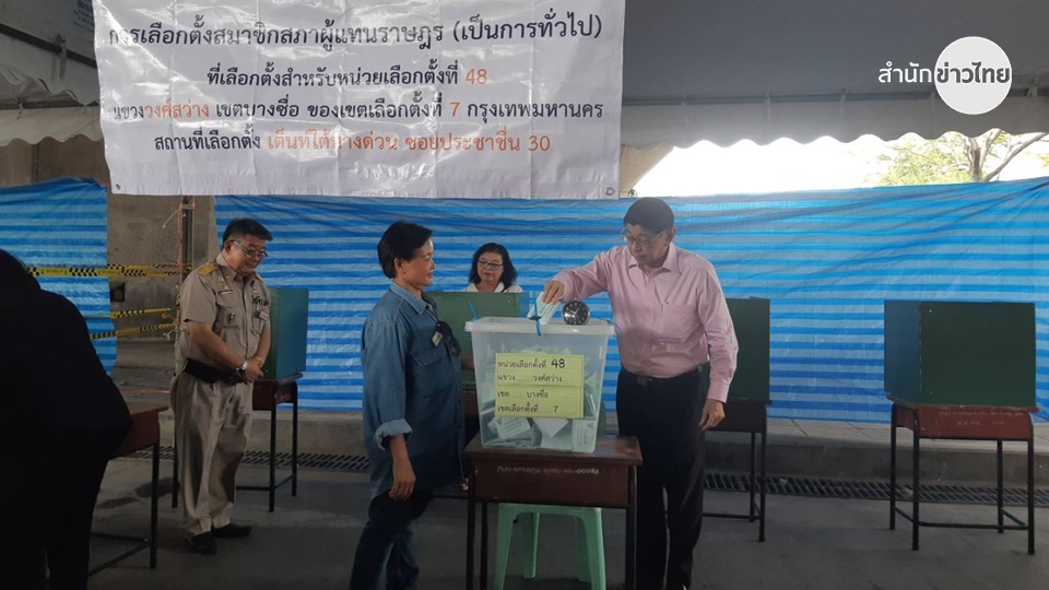 กทม.24 มี.ค.-รองนายกฯใช้สิทธิเลือกตั้งที่หน่วยเลือกตั้งในเขตบางซื่อ น้อมนำพระบรมราโชวาท ในหลวง รัชกาลที่ 9 เลือกคนดีปกครองบ้านเมือง ขณะที่ตลอดช่วงเช้าประชาชนเดินทางมาใช้สิทธิเป็นจำนวนมากส่วนใหญ่เป็นผู้สูงอายุถือไม้เท้ามากับครอบครัว