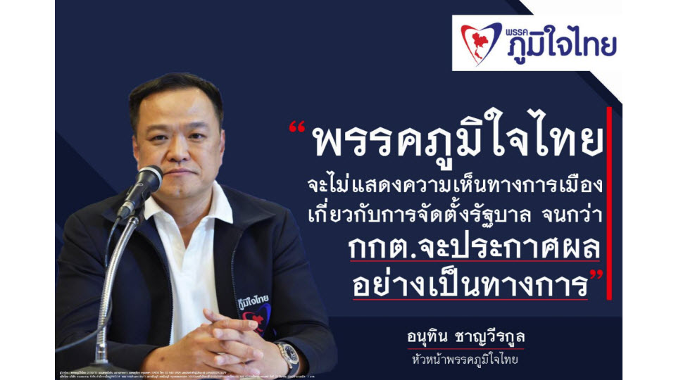 ผู้สื่อข่าวรายงานว่า วันนี้ (25 มี.ค.) นายอนุทิน ชาญวีรกุล หัวหน้าพรรคภูมิใจไทย โพสต์เฟสบุ๊กส่วนตัว “อนุทิน ชาญวีรกูล” จำนวน 2โพสต์ โดย โพสต์แรก ระบุว่า”อดทนรอให้เวลา กกต.ทำงาน ครับ” พร้อมรูปมีข้อความว่า “พรรคภูมิใจไทย จะไม่แสดงความคิดเห็นทางการเมือง เกี่ยวกับการจัดตั้งรัฐบาล จนกว่า กกต.จะประกาศผลอย่างเป็นทางการ”