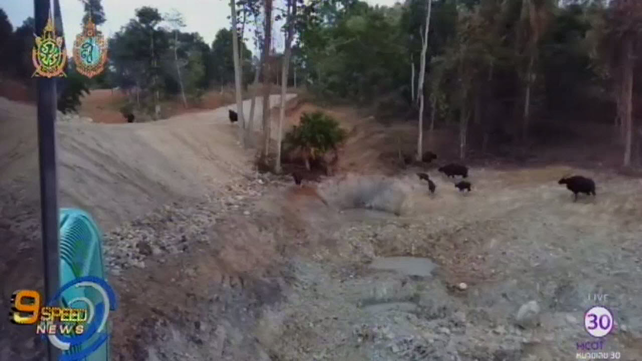 นครราชสีมา 27 ส.ค.-ฝูงกระทิงจำนวนกว่า 30 ตัว ที่คนขับรถแบ็คโฮก่อสร้างฝายกักเก็บน้ำ บริเวณแนวเขตอุทยานแห่งชาติเขาใหญ่ อ.วังน้ำเขียว จ.นครราชสีมา ถ่ายไว้ได้ระหว่างที่กำลังเตรียมขุดหน้าดิน ซึ่งมีน้ำใต้ดินผุดขึ้นมาเล็กน้อย โดยคาดว่ากระทิงจำนวนดังกล่าว กำลังสำรวจหาแหล่งน้ำเพื่อดำรงชีวิต หลังจากช่วง 2 ปีที่ผ่านมา อุทยานฯเขาใหญ่ประสบภัยแล้งต่อเนื่องแหล่งน้ำแห้งขอด ทำให้สัตว์ป่าขาดแคลนน้ำอย่างหนัก.-สำนักข่าวไทย