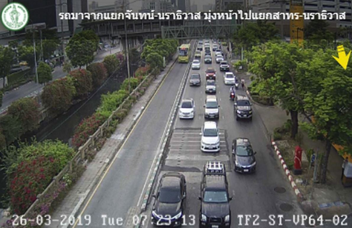 กทม. 26 มี.ค.-สวพ.FM91 รายงานจราจรเช้าวันอังคาร ถนนนราธิวาสฯ ขาเข้า มุ่งหน้าแยกนรินทร รถหนาแน่น ท้ายแถวสะสมซอยนราธิวาสราชนครินทร์ซอย 10