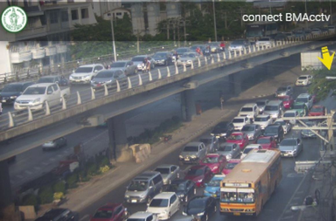 สภาพการจราจร ถนนอโศก-ดินแดง จากแยกพระราม 9 มุ่งหน้าแยกอโศก-เพชรบุรี รถมาก แต่ยังเคลื่อนตัวได้เรื่อยๆ