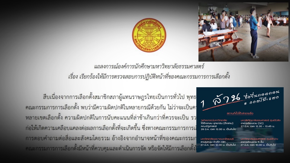 องค์การนักศึกษามหาวิทยาลัยธรรมศาสตร์ ออกแถลงการณ์เรื่องเรียกร้องให้มีการตรวจสอบการปฏิบัติหน้าที่ของคณะกรรมการการเลือกตั้ง ขณะเดียวกันยังประณามถึงการกระทำที่บกพร่อง ส่งผลร้ายแรงต่อประชาธิปไตย โดยระบุว่าสืบเนื่องจากการเลือกตั้งสมาชิกสภาผู้แทนราษฎรไทยเป็นการทั่วไป พุทธศักราช 2562 ภายใต้การทำงานของคณะกรรมการการเลือกตั้ง พบว่ามีความผิดปกติในหลายกรณีด้วยกัน ไม่ว่าจะเป็นความผิดปกติของผลคะแนนที่เกิดขึ้นในหลายเขตเลือกตั้ง ความผิดปกติในการนับคะแนนที่ล่าช้าเกินกว่าที่ควรจะเป็น รวมถึงกรณีการดำเนินการที่หละหลวมก่อให้เกิดความเคลือบแคลงต่อผลการเลือกตั้งที่จะเกิดขึ้น ซึ่งทางคณะกรรมการการเลือกตั้งยังไม่มีเหตุและผลที่เพียงพอในการตอบคำถามต่อสื่อและสังคมโดยรวม อ้างอิงจากอำนาจหน้าที่ของคณะกรรมการการเลือกตั้งตามรัฐธรรมนูญที่ว่า คณะกรรมการการเลือกตั้งมีหน้าที่ควบคุมและดำเนินการจัด หรือจัดให้มีการเลือกตั้งให้เป็นไปโดยสุจริตและเที่ยงธรรม