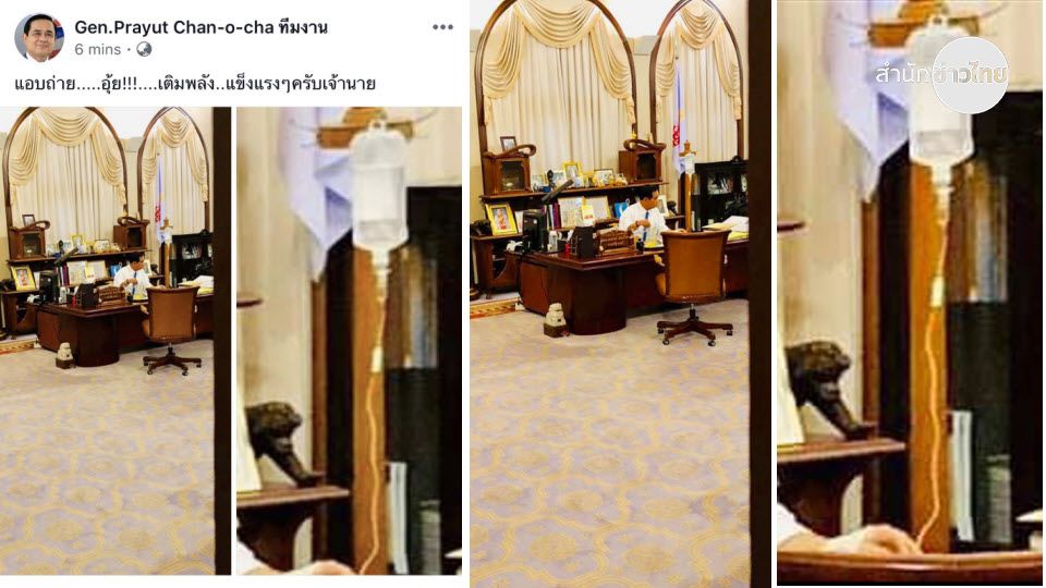 อย่างไรก็ตาม เพจเฟซบุ๊กที่ใช้ชื่อว่า Gen.Prayut Chan-o-cha ทีมงาน ได้โพสภาพถ่ายของ พล.อ.ประยุทธ์ ที่นั่งทำงานภายในห้องทำงาน บนตึกไทยคู่ฟ้า โดยที่มือข้างซ้ายมีสายน้ำเกลือ พร้อมระบุข้อความว่า “แอบถ่าย…อุ้ย!!! …เติมพลัง….แข็งแรงๆ ครับเจ้านาย”