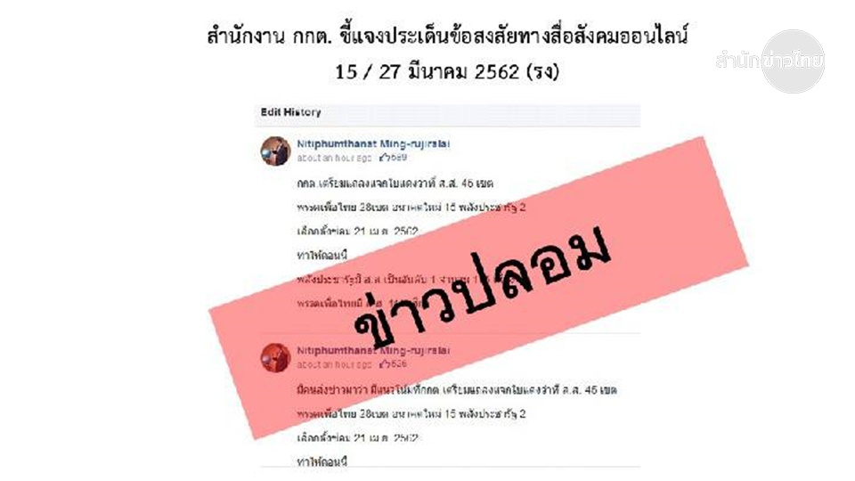 สำนักงานประชาสัมพันธ์ สำนักงาน กกต. ชี้แจงกรณีที่เฟซบุ๊กชื่อ นิติภูมิธณัฐ มุ่งรุจิราลัย และทวิตเตอร์ @nitipoom 1959 โพสต์ข้อความระบุว่า กกต.เตรียมแถลงแจกใบแดงว่าที่ ส.ส. 45 เขต พรรคเพื่อไทย 28 เขต อนาคตใหม่ 15 พลังประชารัฐ 2 เลือกตั้งซ่อม 21 เม.ย.2562 ทำให้ตอนนี้พลังประชารัฐ มี ส.ส.เป็นอันดับ 1 จำนวน 115 เสียง พรรคเพื่อไทยมี ส.ส.ราว 111 เสียง