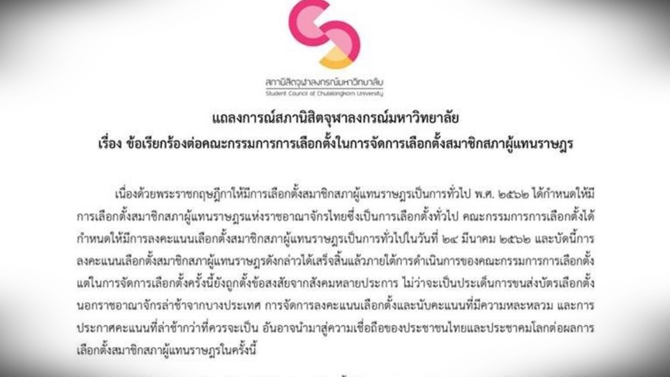 สำนักข่าวไทย 28 มี.ค.- สภานิสิตจุฬาฯ แถลงการณ์เรียกร้อง กกต.แสดงความรับผิดชอบ ชี้แจงข้อสงสัยทุกประเด็นในการเลือกตั้ง และเปิดผลการเลือกตั้งโดยเร็วที่สุด