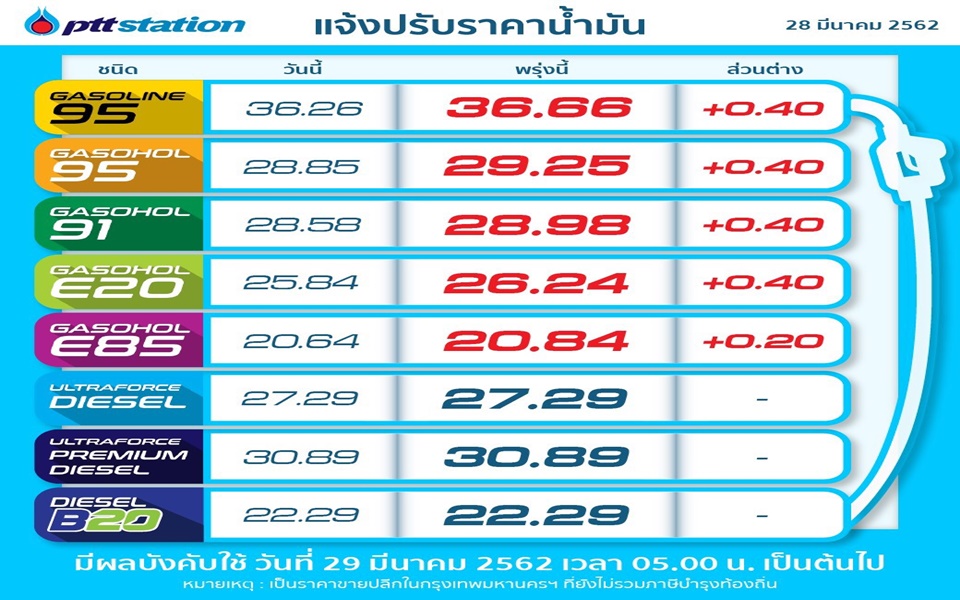 ปตท.-บางจากฯ ปรับราคาขายปลีกน้ำมันกลุ่มเบนซินและแก๊สโซฮอล์เพิ่มขึ้น 40 สตางค์ต่อลิตร ยกเว้น E85 เพิ่มขึ้น 20 สตางค์ต่อลิตร ส่วนดีเซล ดีเซลพรีเมี่ยม และ B20 คงเดิม มีผล 29 มีนาคม 2562 เวลา 05.00 น. เป็นต้นไป โดยราคาขายปลีกจะเป็นดังนี้ เบนซิน 95 ลิตรละ 36.66 บาท แก๊สโซฮอล์ 95 ลิตรละ 29.25 บาท E20 ลิตรละ 26.24 บาท แก๊สโซฮอล์ 91 ลิตรละ 28.98 บาท E85 ลิตรละ 20.84 บาท ดีเซล 27.29 บาท ดีเซลพรีเมี่ยม 30.89 บาท B20 ลิตรละ 22.29 บาทต่อลิตร โดยราคาขายปลีกข้างต้นยังไม่รวมภาษีบำรุงกรุงเทพมหานคร.-สำนักข่าวไทย