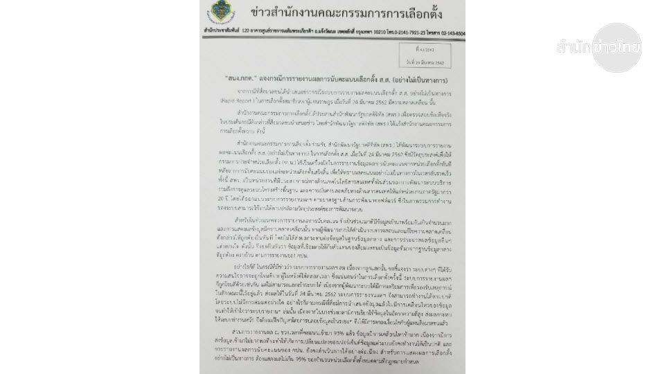สำนักงานคณะกรรมการการเลือกตั้ง (กกต.) ได้ออกเอกสารข่าว ชี้แจงกรณีที่สื่อมวลชนได้นำเสนอข่าวกรณีระบบการรายงานผลคะแนนเลือกตั้ง ส.ส. อย่างไม่เป็นทางการ (Rapid Report ) ในการเลือกตั้งสมาชิกสภาผู้แทนราษฎร เมื่อวันที่ 24 มีนาคม 2562 มีความคลาดเคลื่อน ว่า กกต.ได้ประสานสำนักพัฒนารัฐบาลดิจิทัล (สพร.) ซึ่งเป็นผู้พัฒนาระบบรายงานผลคะแนนเลือกตั้ง ส.ส. (อย่างไม่เป็นทางการ) ยืนยันว่า ในช่วงแรกของการรายงานผลการนับคะแนน ซึ่งเป็นช่วงเวลาที่มีข้อมูลเข้ามาพร้อมกันเป็นจำนวนมาก และการแสดงผลข้อมูลมีความคลาดเคลื่อน สพร.ดำเนินการตรวจสอบและแก้ไขความคลาดเคลื่อนดังกล่าวให้ถูกต้องในทันที โดยไม่ได้ส่งผลกระทบต่อข้อมูลในฐานข้อมูลกลาง และการประมวลผลข้อมูลอื่นๆ แต่อย่างใด ดังนั้น จึงขอยืนยันว่า ข้อมูลที่เชื่อมต่อให้กับตัวแทนของสื่อมวลชนเป็นข้อมูลที่มาจากฐานข้อมูลกลาง ที่ถูกต้อง ครบถ้วน ตามการรายงานของกรรมการประจำหน่วยเลือกตั้ง (กปน.)