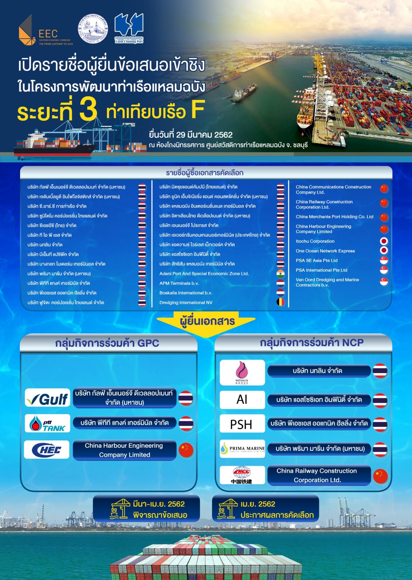 ทั้งนี้ คาดว่าผลการประเมินข้อเสนอของเอกชน จะเสร็จสิ้นภายในเดือนเมษายนนี้ สำหรับเอกชนที่ได้รับคัดเลือกให้ร่วมลงทุนโครงการพัฒนาท่าเรือแหลมฉบัง ระยะที่ 3 ในส่วนของท่าเทียบเรือ F จะมีหน้าที่รับผิดชอบออกแบบ ก่อสร้าง ให้บริการ และบำรุงรักษาในงานส่วนโครงสร้างหน้าท่า (Superstructure) รวมทั้งเครื่องจักรและอุปกรณ์ที่เกี่ยวข้อง และระบบจัดการตู้สินค้าแบบอัตโนมัติ (Automation) เป็นระยะเวลา 35 ปี โดยคาดว่าจะเปิดดำเนินโครงการประมาณปี 2566