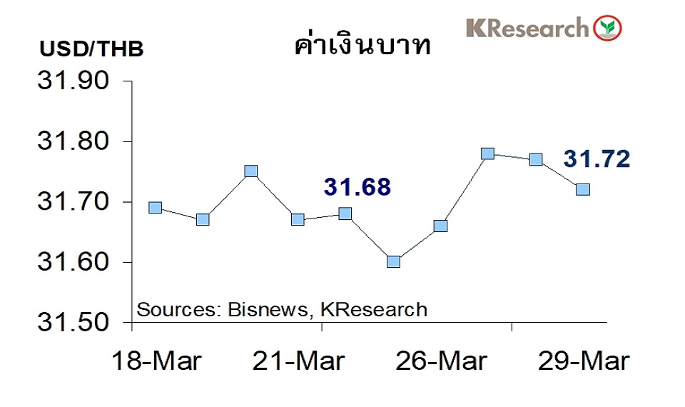 สำหรับสัปดาห์ถัดไป (1-5 เม.ย.) ธนาคารกสิกรไทยประเมินกรอบการเคลื่อนไหวของเงินบาทที่ 31.60-32.00 บาทต่อดอลลาร์ฯ โดยต้องจับตา
