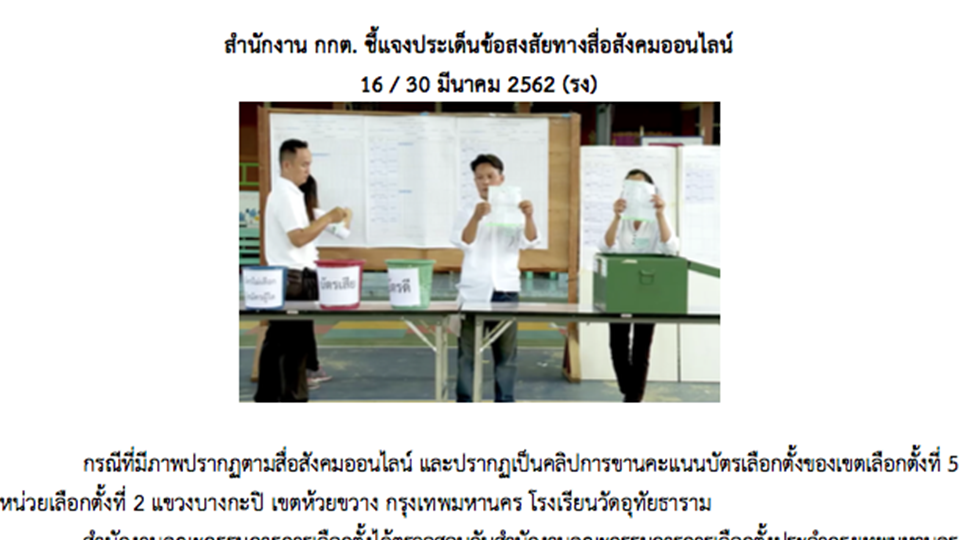 สำนักงานกกต. ชี้แจงประเด็นข้อสงสัยทางสื่อสังคมออนไลน์ 16/30 มีนาคม 2562 (รง) กรณีที่มีภาพปรากฎตามสื่อสังคมออนไลน์ และปรากฎเป็นคลิปการขานคะแนนบัตรเลือกตั้งของเขตเลือกตั้งที่ 5 หน่วยเลือกตั้งที่ 2 แขวงบางกะปิ เขตห้วยขวาง กรุงเทพมหานคร โรงเรียนวัดอุทัยธาราม