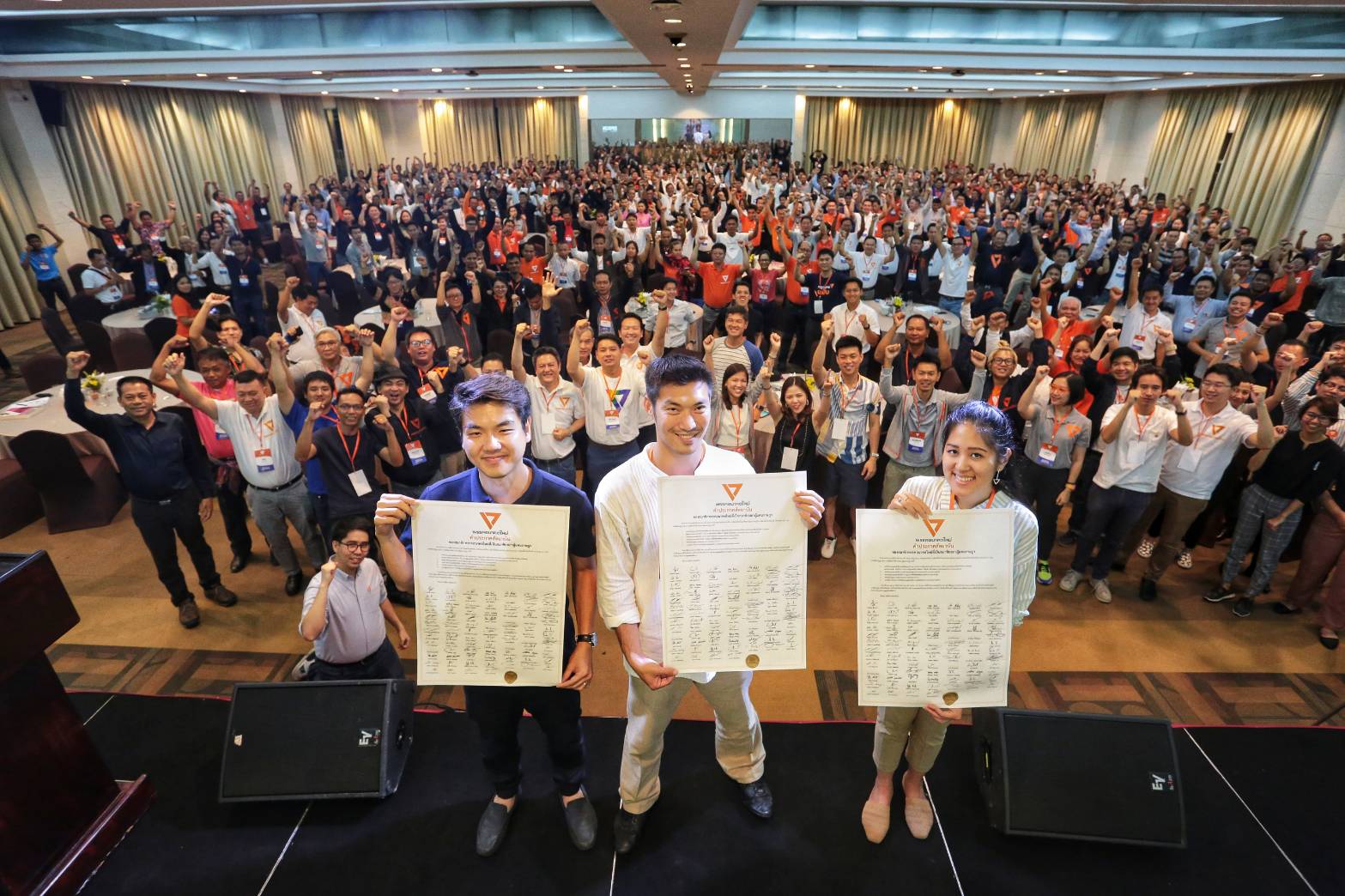 จากนั้น นายธนาธร ได้อ่านคำประกาศสัตยาบันของสมาชิกพรรคอนาคตใหม่ที่เป็น ส.ส. ซึ่งระบุว่า ด้วยข้าพเจ้าตามรายชื่อท้ายคำประกาศนี้ เป็นสมาชิกพรรคอนาคตใหม่ และได้รับการเลือกตั้งให้เป็นสมาชิกสภาผู้แทนราษฎรในการเลือกตั้งทั่้วไป เมื่อวันที่ 24 มีนาคม พ.ศ.2562 ขอให้สัตย์ปฏิญาณในการปฏิบัติหน้าที่สมาชิกสภาผู้แทนราษฎร ดังนี้ คือจะสนับสนุนและผลักดันบุคคลที่สมควรดำรงตำแหน่งนายกรัฐมนตรีตามมติของพรรคอนาคตใหม่ และจะไม่เสนอชื่อหรือให้ความเห็นชอบ พล.อ.ประยุทธ์ จันทร์โอชา เป็นนายกรัฐมนตรีอย่างเด็ดขาด เพื่อยุติการสืบทอดอำนาจของคณะรักษาความสงบแห่งชาติ (คสช.) รวมถึงจะสนับสนุนการลบล้างผลพวงรัฐประหารของ คสช. สนับสนุนให้มีการปฏิรูปกองทัพให้สอดคล้องกับหลักการประชาธิปไตย ยึดมั่นในอุดมการณ์ของพรรคอนาคตใหม่ทุกประการ และจะต่อสู้ร่วมกันจนกว่าจะได้รัฐธรรมนูญใหม่ที่อำนาจสูงสุดเป็นของประชาชนอย่างแท้จริง.-สำนักข่าวไทย