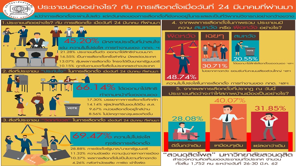 สวนดุสิตโพล มหาวิทยาลัยสวนดุสิตได้สำรวจความคิดเห็นของประชาชนทั่วประเทศ จำนวนทั้งสิ้น 1,752 คน ระหว่างวันที่ 26-30 มีนาคม 2562 เรื่อง ประชาชนคิดอย่างไร? กับ การเลือกตั้งเมื่อวันที่ 24 มีนาคมที่ผ่านมา ผลปรากฎว่า ประชาชนร้อยละ 45.20 เห็นว่า หลายประเด็นที่น่าสนใจ เช่น ความไม่โปร่งใส การทำงานของ กกต.และข้อผิดพลาดที่เกิดขึ้น ร้อยละ21.28 เห็นว่าประชาชนตื่นตัว ออกมาใช้สิทธิจำนวนมาก ร้อยละ 16.55 เห็นว่า เป็นการเลือกตั้งครั้งสำคัญ มีผลต่อบ้านเมืองและเศรษฐกิจของประเทศ และร้อยละ13.07 รอลุ้นผลการเลือกตั้ง พรรคไหนจะได้จัดตั้งรัฐบาล ใครจะได้เป็นนายกรัฐมนตรี