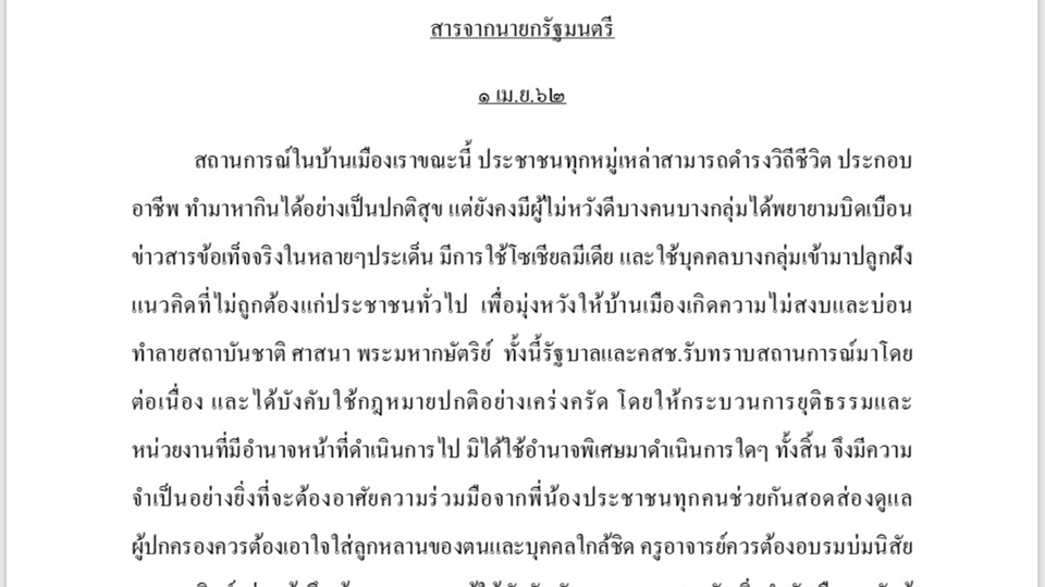 กรุงเทพฯ 1 เม.ย.-นายกรัฐมนตรี ส่งสารถึงคนไทย ยอมรับมีกลุ่มบิดเบือนข่าวสาร มุ่งสร้างความไม่สงบในบ้านเมือง ขอผู้ปกครอง-ครูอาจารย์ ดูแลบุตรหลาน-ลูกศิษย์ ร่วมมือปกป้องประเทศให้มั่นคง
