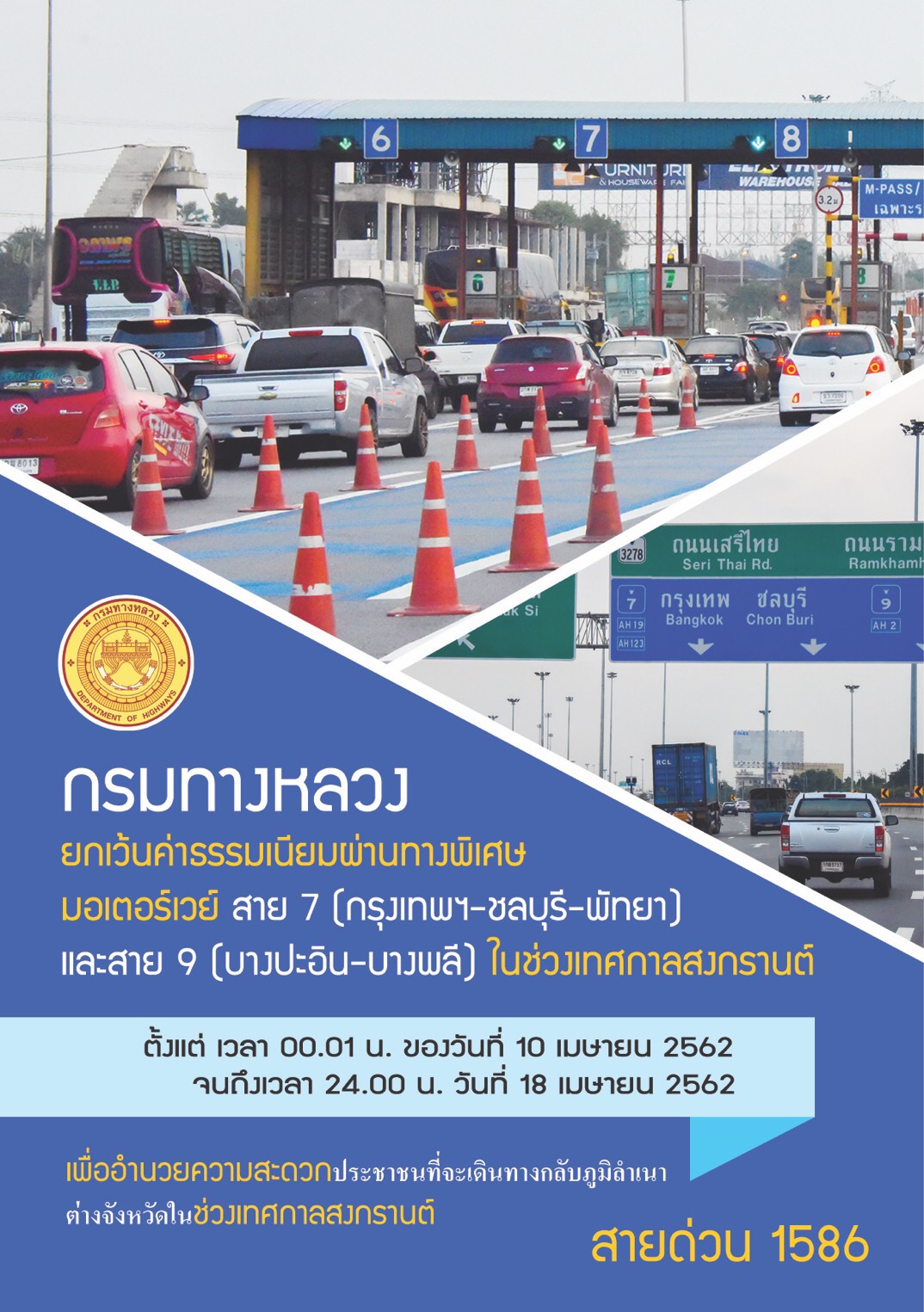 นายอานนท์ เหลืองบริบูรณ์ อธิบดีกรมทางหลวง เปิดเผยว่า เพื่ออำนวยความสะดวกในการเดินทางให้กับประชาชนและทำให้การจราจรมีความคล่องตัว รวมทั้งเป็นการลดการใช้พลังงานของประเทศในช่วงเทศกาลสงกรานต์ ปี 2562 กรมทางหลวงได้ยกเว้นค่าธรรมเนียมการใช้ยานยนต์บนทางหลวงพิเศษหมายเลข 7 และหมายเลข 9 ในช่วงเทศกาลสงกรานต์ ตั้งแต่เวลา 00.01 น. ของวันที่ 10 เม.ย. 62 ถึงเวลา 24.00 น. ของวันที่ 18 เม.ย. 62