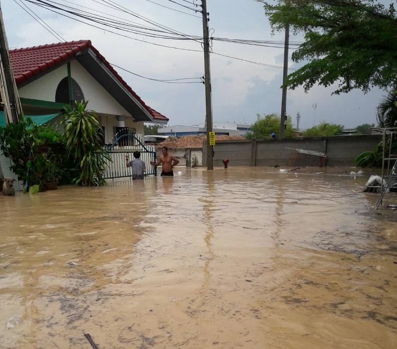 สภาพบ้านเรือนในซอยเขาตาโล 5 ต.หนองปรือ อ.บางละมุง จ.ชลบุรี หลังจากพายุฤดูร้อนถล่มกว่า 2 ชั่วโมง ตั้งแต่ช่วงสายวันนี้ (2 เม.ย.) นอกจากเกิดน้ำท่วมขังรอการระบายถนนสายสำคัญในตัวเมืองพัทยาแล้ว น้ำได้ไหลเข้าบ้านเรือนอย่างรวดเร็ว ยังไม่ทันเก็บข้าวของเครื่องใช้ รวมทั้งรถยนต์และรถจักรยานยนต์ แม้ล่าสุดน้ำลดลงกลับสู่ภาวะปกติแล้ว แต่พื้นที่เต็มไปด้วยคราบดินโคลนและเศษขยะที่ไหลมากับน้ำ ชาวบ้านเร่งกันทำความสะอาด เพราะหากปล่อยไว้ดินโคลนจะแห้งเป็นคราบ และทำความสะอาดยาก