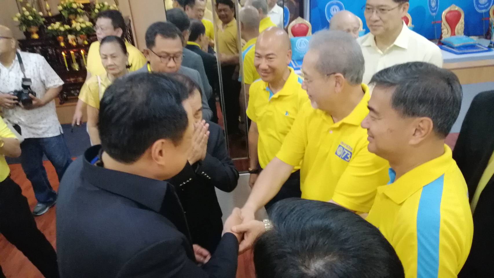 พรรคประชาธิปัตย์ 6 เม.ย.- นายอนุทิน ชาญวีรกูล หัวหน้าพรรคภูมิใจไทย กล่าวภายหลังร่วมแสดงความยินดีกับพรรคประชาธิปัตย์ ครบรอบก่อตั้ง 73 ปี ว่าตนได้พบกับนายอภิสิทธิ์ เวชชาชีวะ อดีตหัวหน้าพรรคประชาธิปัตย์ ซึ่งได้รับการต้อนรับอย่างอบอุ่นเหมือนทุกปี วันนี้ไม่มีอะไรพิเศษ เพราะพรรคภูมิใจไทยและพรรคประชาธิปัตย์มีครบรอบพรรควันเดียวกัน จึงมีการสลับกันไปอวยพรเป็นประจำทุกปี โดยนายอภิสิทธิ์ได้ฝากให้ตนเองช่วยกันประคับประคองบ้านเมืองให้เดินหน้า