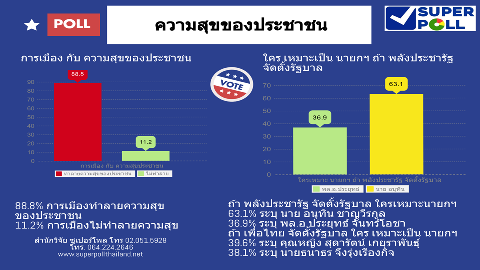 กรุงเทพฯ 7 เม.ย.-ซุปเปอร์โพล เผยผลสำรวจประชาชนร้อยละ 88.8ระบุการเมืองทำลายความสุขคนไทย หากพลังประชารัฐเป็นแกนนำตั้งรัฐบาลอยากเห็น “อนุทิน”เป็นนายกฯ
