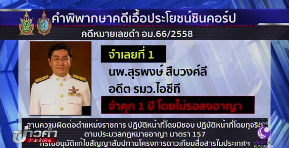 แผนกคดีอาญาของผู้ดำรงตำแหน่งทางการเมือง ซึ่งวันนี้ศาลมีคำพิพากษาจำคุก นพ.สุรพงษ์ 1 ปี โดยไม่รอลงอาญา ส่วนจำเลยอีก 2 คน คือ นายไกรสร พรสุธี และนายไชยยันต์ พึ่งเกียรติไพโรจน์ ศาลพิพากษาจำคุก 1 ปี ปรับ 20,000 บาท แต่ให้รอลงอาญา 5 ปี เนื่องจากศาลเห็นว่าการกระทำของจำเลยทั้งสามที่มีหน้าที่ดูแลรักษาผลประโยชน์รัฐ แต่กลับละเว้นการปฏิบัติหน้าที่โดยมิชอบเพื่อให้เกิดความเสียหายกับสำนักกิจการอวกาศแห่งชาติ ก.ไอซีที เพื่อเอื้อประโยชน์ให้กับบริษัท ชินคอร์ปอเรชั่น จำกัด (มหาชน) และบริษัท ไทยคม จำกัด (มหาชน) ผู้รับสัมปทานจากรัฐ