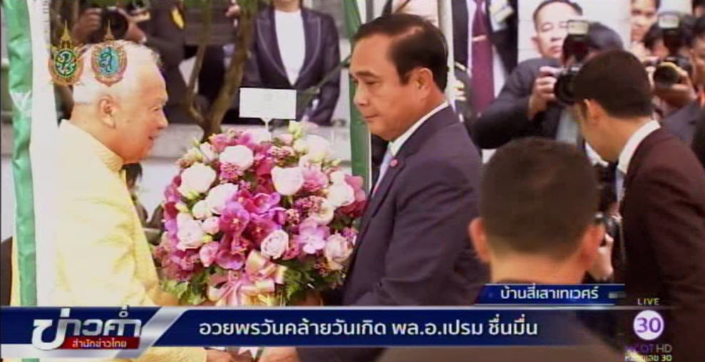 กทม. 25 ส.ค. – วันนี้ พล.อ.ประยุทธ์ จันทร์โอชา นายกรัฐมนตรี นำคณะรัฐมนตรี พร้อมผู้บัญชาการเหล่าทัพ ตบเท้าเข้าอวยพรวันคล้ายวันเกิด พล.อ.เปรม ประธานองคมนตรีและรัฐบุรุษ ซึ่งจะอายุครบ 96 ปี ในวันพรุ่งนี้ (26 ส.ค.)