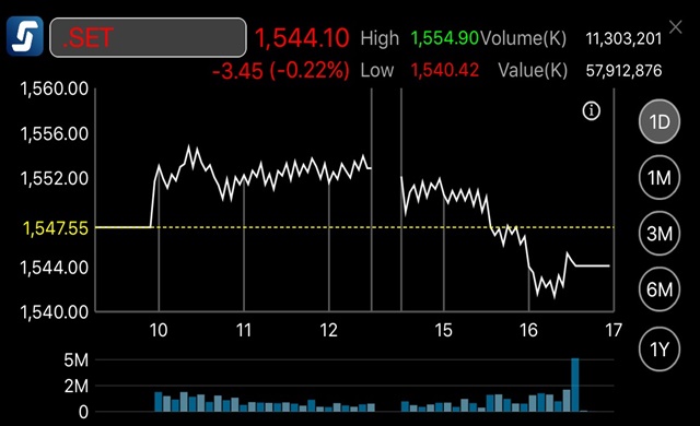 ตลท. 25 ส.ค. – ผู้สื่อข่าวรายงานว่าดัชนีตลาดหลักทรัพย์ปิดการซื้อขายวันนี้ (25 ส.ค.) ที่ระดับ 1, 544.10 จุด ลดลง 3.45 จุด หรือร้อยละ 0.22 มูลค่าการซื้อขาย 57,913.68 ล้านบาท โดยเปิดตลาดช่วงเช้าดัชนีสามารถยืนแดนบวกสูงสุดของวันที่ระดับ 1,554.90 จุด แต่ในช่วงบ่ายมีแรงขายทำกำไรกดดันดัชนีลงมาต่ำสุดของวันที่ 1,540.42 จุด