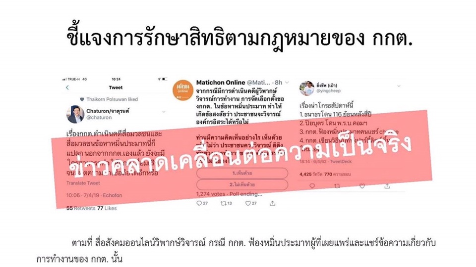 สำนักงานคณะกรรมการการเลือกตั้ง (กกต.) ชี้แจงกรณีที่สื่อสังคมออนไลน์วิพากษ์วิจารณ์ ว่าการที่กกต.ฟ้องหมิ่นประมาท ผู้ที่เผยแพร่และแชร์ข้อความเกี่ยวกับการทำงานของ กกต. นั้น ประเด็นที่สื่อสังคมออนไลน์วิพากษ์วิจารณ์การทำงานของ กกต. บุคคล หรือหน่วยงานอื่น ๆ ของทางราชการ ย่อมเป็นสิทธิขั้นพื้นฐานที่บุคคลทุกคนสามารถกระทำได้ ตามบทบัญญัติแห่งรัฐธรรมนูญและกฏหมาย