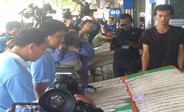 แยกคอกวัว 25 ส.ค. – นายธนวรรธน์ พลวิชัย กรรมการสลากกินแบ่งรัฐบาล พร้อมด้วยเจ้าหน้าที่ตำรวจ ทหาร ลงพื้นที่ตลาดค้าส่งสลากกินแบ่งรัฐบาลแยกคอกวัว ถนนราชดำเนิน เพื่อตรวจดูปัญหาสลากเกินราคา หลังจากมีประชาชนร้องเรียนผ่านช่องทางต่าง ๆ ทั้งสลากรวมชุดเกินราคา เมื่อรวมชุด 5 ใบ จำหน่าย 450-500 บาท และเริ่มรวมชุดเพิ่มจาก 5,10,20 ใบ ขณะที่สลากใบขายราคา 80-90 บาท