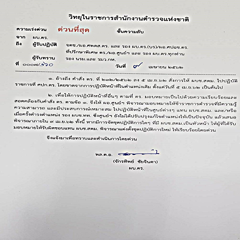เพื่อให้การปฏิบัติหน้าที่อื่นๆตามที่ ตร.มอบหมายเป็นไปด้วยความเรียบร้อยและสอดคล้องกับคำสั่ง ตร.จึงให้ ผอ.ศูนย์ฯ พิจารณามอบหมายให้ข้าราชการตำรวจที่มีความรู้ความสามารถและมีประสบการเหมาะสมไปปฏิบัติหน้าที่ในศูนย์ต่างๆแทน ผบช.สตม.และ/หรือเมื่อครั้งดำรงตำแหน่ง รอง ผบช.ทท.ซึ่งศูนย์ฯยังไม่ได้ปรับปรุงแก้ไขตำแหน่งให้เป็นปัจุบัน แล้วเสนอพิจารณาภายในวันที่ 9 เม.ย.62 ทั้งนี้หากมีการจัดชุดปฏิบัติการใดๆที่มี ผบช.สตม.เป็นหัวหน้า ให้ผู้ที่ได้รับมอบหมายให้รับผิดชอบแทน ผบช.สตม. พิจารณาแต่งตั้งชุดปฏิบัติการใหม่ให้เรียบร้อยโดยด่วน จึงแจ้งมาเพื่อทราบและดำเนินการโดยด่วน”หนังสื่อดังกล่าวระบุ.-สำนักข่าวไทย