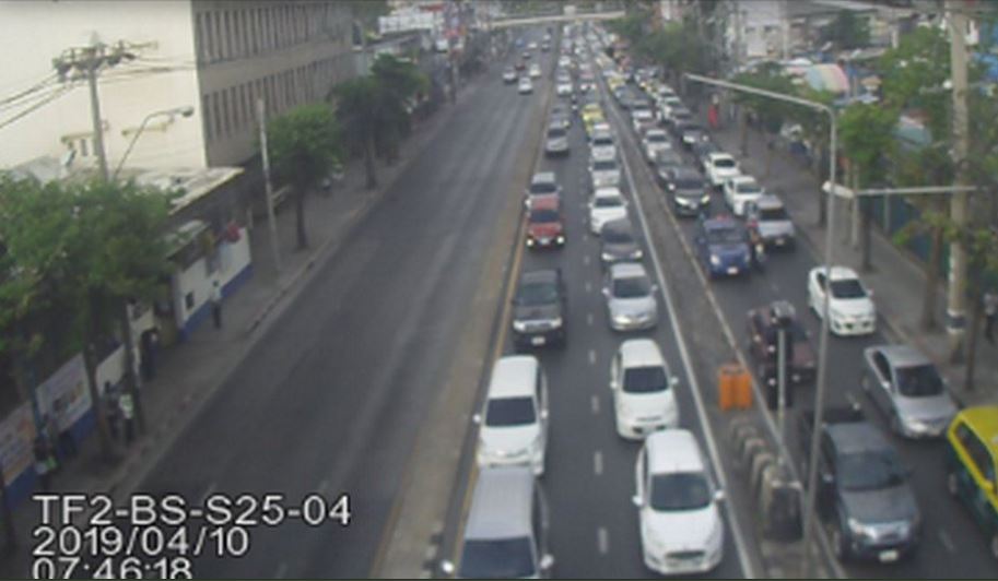 กทม. 10 เม.ย.-สวพ.FM 91 รายงานจราจรเช้าวันพุธ ถ.รัชดาภิเษก ขาเข้า มุ่งหน้าแยกวงศ์สว่าง ท้ายแถวสะสมอยู่ที่ทางลงสะพานพระราม 7