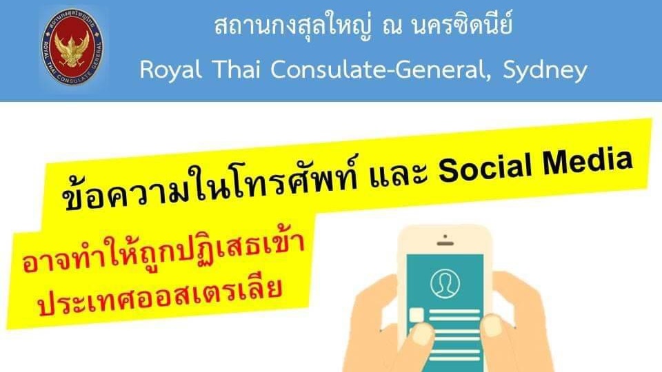 สถานกงสุลใหญ่ ณ นครซิดนีย์ ประเทศออสเตรเลีย โพสต์ข้อความผ่านทางเฟซบุ๊ก แนะนำข้อมูลแก่นักท่องเที่ยวชาวไทย ที่จะเดินทางไปประเทศออสเตรเลีย ระวังข้อความในโทรศัพท์ และใน Social Media อาจทำให้ถูกปฏิเสธเข้าประเทศออสเตรเลีย หรือถูกดำเนินคดีได้ เนื่องด้วยออสเตรเลียเป็นประเทศที่มีความเข้มงวดและเคร่งครัดของกฎระเบียบการเข้าเมือง ดังนั้นนักท่องเที่ยวที่ต้องการเดินทางมาท่องเที่ยว หรือมาศึกษาที่ประเทศออสเตรเลีย ควรศึกษาหาข้อมูลในกฎระเบียบข้อบังคับต่าง ๆ มิฉะนั้นอาจถูกปฏิเสธในการเข้าประเทศได้