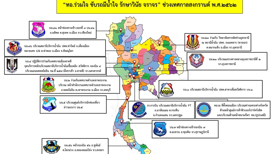 กองทัพอากาศ จัดโครงการ “กองทัพอากาศร่วมใจ ขับรถมีน้ำใจ รักษาวินัยจราจร” ในช่วงเทศกาลสงกรานต์ ประจำปี 2562 โดยจัดตั้งจุดบริการช่วยเหลือประชาชนที่เดินทางกลับภูมิลำเนาและท่องเที่ยวในช่วงเทศกาลสงกรานต์ จำนวน 14 จุดทั่วประเทศ เพื่อป้องกันและลดปัจจัยเสี่ยงที่เป็นสาเหตุสำคัญของการเกิดอุบัติเหตุทางถนน และป้องกันการเกิดอุบัติภัยอื่น ๆ รวมทั้งดูแลความปลอดภัย และอำนวยความสะดวกให้กับประชาชน ซึ่งในแต่ละจุด ประกอบด้วย ชุดแพทย์พยาบาลเพื่อให้บริการทางการแพทย์เบื้องต้น รถพยาบาลพร้อมอุปกรณ์ ชุดช่างเพื่อให้บริการตรวจเช็คและบำรุงรักษายานพาหนะเบื้องต้น รถลากจูงกรณีมีรถเสียกีดขวางการจราจร ชุดสารวัตรทหารอากาศอำนวยความสะดวกด้านการจราจรและรักษาความปลอดภัย ตลอดจนบริการกาแฟ น้ำดื่ม ผ้าเย็น และเตียงสนาม สำหรับประชาชนที่จอดพักรถได้ผ่อนคลายอิริยาบถ โดยแต่ละจุดจะเปิดให้บริการ ระหว่างวันที่ 11-17 เมษายน 2562 เวลา 06.00-19.00 น.