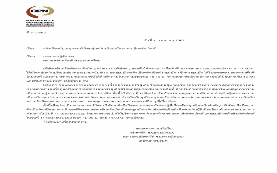 บมจ.เซ็นทรัลพัฒนา (CPN) แจ้งตลาดหลักทรัพย์แห่งประเทศไทย (ตลท.) ว่า เมื่อวันที่ 10 เมษายน 2562 เวลาประมาณ 17.40 น. ได้เกิดกลุ่มควันบริเวณช่องท่อระบายควัน ชั้น 8 ของศูนย์การค้าเซ็นทรัลเวิลด์ ซึ่งทางศูนย์ฯ ได้รีบอพยพคนออกจากพื้นที่โดยทันที และสามารถควบคุมกลุ่มควันได้สำเร็จภายในเวลาประมาณ 18.10 น. จากเหตุการณ์ดังกล่าวส่งผลให้มีผู้บาดเจ็บ 16 คน และพนักงานบริษัทเสียชีวิต 2 คน บริษัทขอแสดงความเสียใจอย่างยิ่งต่อครอบครัวผู้เสียชีวิตและผู้บาดเจ็บ โดยบริษัทจะดำเนินการอย่างเต็มความสามารถ เพื่อดูแลรับผิดชอบต่อครอบครัวผู้เสียชีวิตและผู้บาดเจ็บอย่างเต็มที่