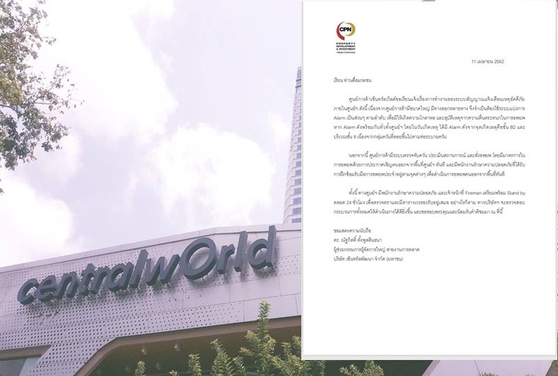 บริษัท เซ็นทรัลพัฒนา จำกัด ออกประกาศฉบับที่ 4 แจ้งเรื่องการทำงานของสัญญาณแจ้งเตือนไฟไหม้ โดยประกาศระบุว่า