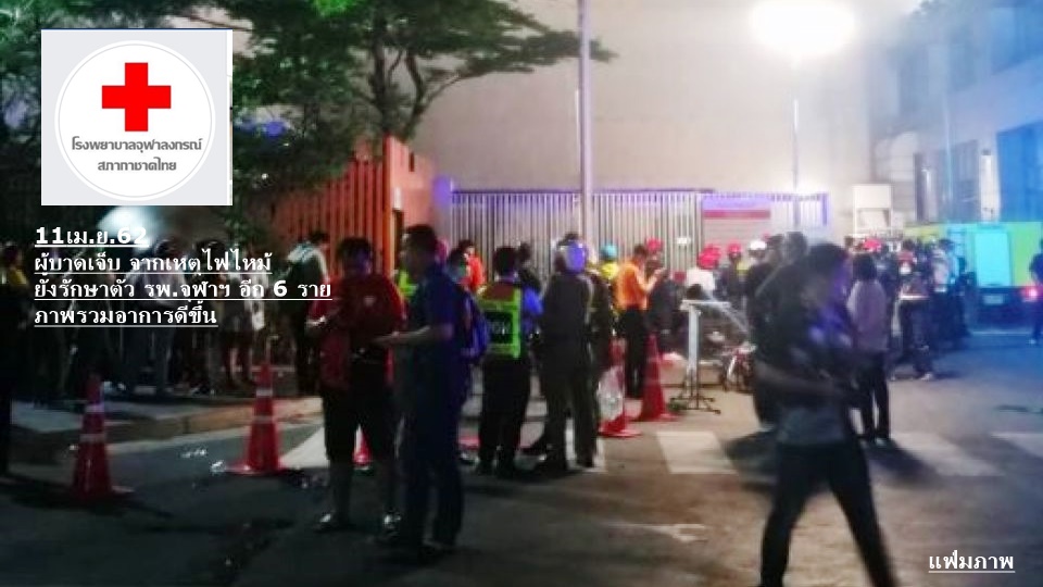 สำนักข่าวไทย 11 เม.ย. – รพ.จุฬาฯ เผยอาการผู้บาดเจ็บไฟไหม้เซ็นทรัลเวิลด์ เหลือรักษาตัว 6 ราย ส่วนใหญ่สำลักควัน ตื่นตกใจ ภาพรวมอาการดีขึ้น
