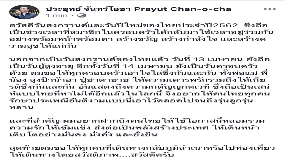 พล.อ.ประยุทธ์ จันทร์โอชา นายกรัฐมนตรี โพสต์ข้อความลงเพจเฟสบุ๊ก “ประยุทธ์ จันทร์โอชา Prayut Chan-o-cha” ข้อความว่า สวัสดีวันสงกรานต์และวันปีใหม่ของไทย ประจำปี 2562 ซึ่งถือเป็นช่วงเวลาที่สมาชิกในครอบครัวได้กลับมาใช้เวลาอยู่ร่วมกันอย่างพร้อมหน้าพร้อมตา สร้างขวัญ สร้างกำลังใจ และสร้างความสุขให้แก่กัน