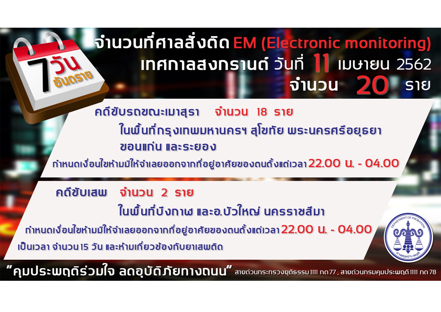 อธิบดีกรมคุมประพฤติ กล่าวว่า ในช่วงเทศกาลสงกรานต์ กรมคุมประพฤติ มีมาตรการเข้มสำหรับผู้กระทำผิดตาม พ.ร.บ.จราจรทางบก พ.ศ. 2522 ภายใต้คำสั่งศาล ซึ่งนอกจากการรายงานตัวต่อพนักงานคุมประพฤติแล้วต้องทำงานบริการสังคม เพื่อสร้างจิตสำนึกและให้ตระหนักถึงความรับผิดชอบต่อสังคม เช่น การช่วยอำนวยความสะดวก ณ จุดตรวจค้น จุดบริการประชาชน ด่านชุมชน การเป็นอาสาจราจร ตลอดจนบริการช่วยเหลือประชาชน คนชรา คนพิการ ที่มีกระเป๋าสัมภาระในการเดินทางกลับภูมิลำเนา สำหรับมาตรการกับผู้กระทำผิดซ้ำ กรมคุมประพฤติจะดำเนินการคัดกรองตามแบบประเมินพฤติกรรมการดื่มเครื่องดื่มแอลกอฮอล์ หากพบว่ามีความเสี่ยงสูงในการติดสุราจะส่งต่อให้กระทรวงสาธารณสุขดำเนินการเพื่อรับการบำบัดรักษาฟื้นฟูสภาพผู้ดื่มแล้วขับตามสถานพยาบาล ภายใต้โครงการ “บำบัดรักษาฟื้นฟูสภาพผู้ดื่มแล้วขับ ถูกจับ ผิดซ้ำ ในช่วงเทศกาลสงกรานต์ ปี พ.ศ. 2562” ซึ่งเป็นกิจกรรมที่ต่อเนื่องมาจากช่วงเทศกาลปีใหม่ที่ผ่านมา.-สำนักข่าวไทย