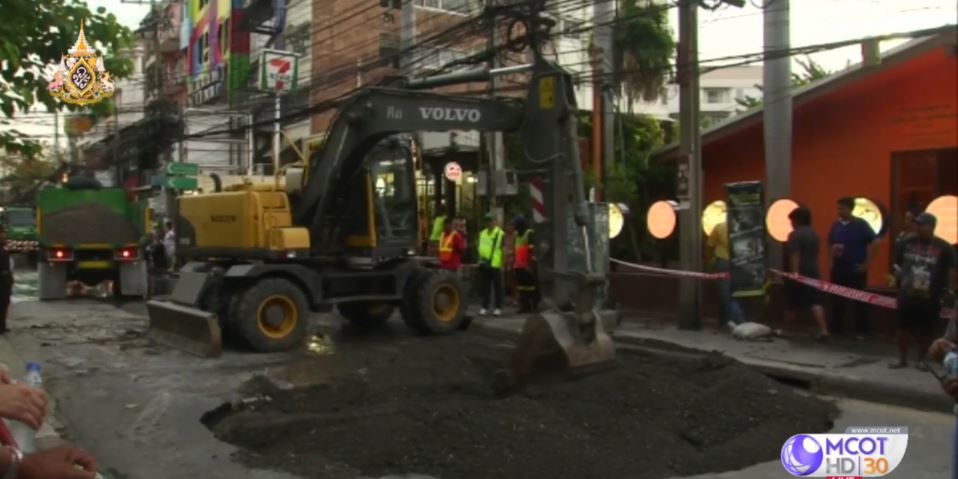 กรุงเทพฯ 13 เม.ย.- เจ้าหน้าที่เร่งกลบหลุมขนาดใหญ่ที่ยุบตัวลงบนถนนในซอยสุขุมวิท 4 หรือซอยนานา