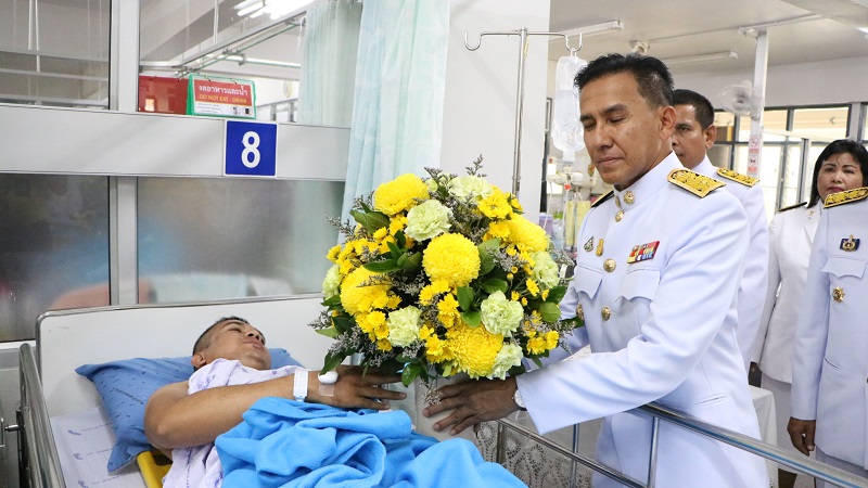 นราธิวาส 14 เม.ย.- ทหารร้อย ทพ.4513 ทั้ง 5 นาย สุดซาบซึ้งพระมหากรุณาธิคุณสมเด็จพระเจ้าอยู่หัว พระราชทานตะกร้าสิ่งของเยี่ยมอาการบาดเจ็บจากการปฏิบัติหน้าที่ถูกผู้ก่อเหตุลอบวางระเบิดริมถนนบ้านวังทอง-ระแงะ
